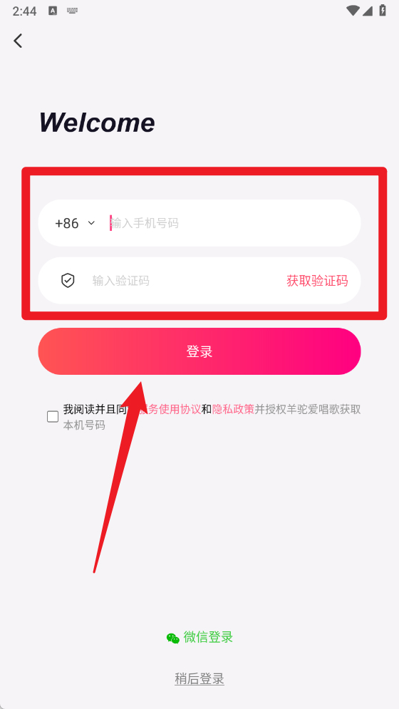 2、在登录页面输入手机号并获取验证码,填写完成后点击登录,也可以选择使用微信账号进行登录。