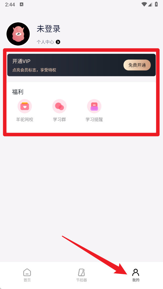 5、在我的页面,可以查看个人信息、开通VIP服务以及访问学习群、学习提醒等附加功能。