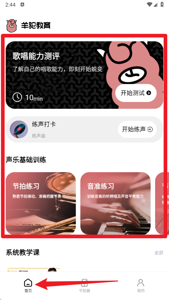 3、进入首页后,可进行歌唱能力测评、练声打卡、音准练习和节拍练习,帮助提升唱歌水平。