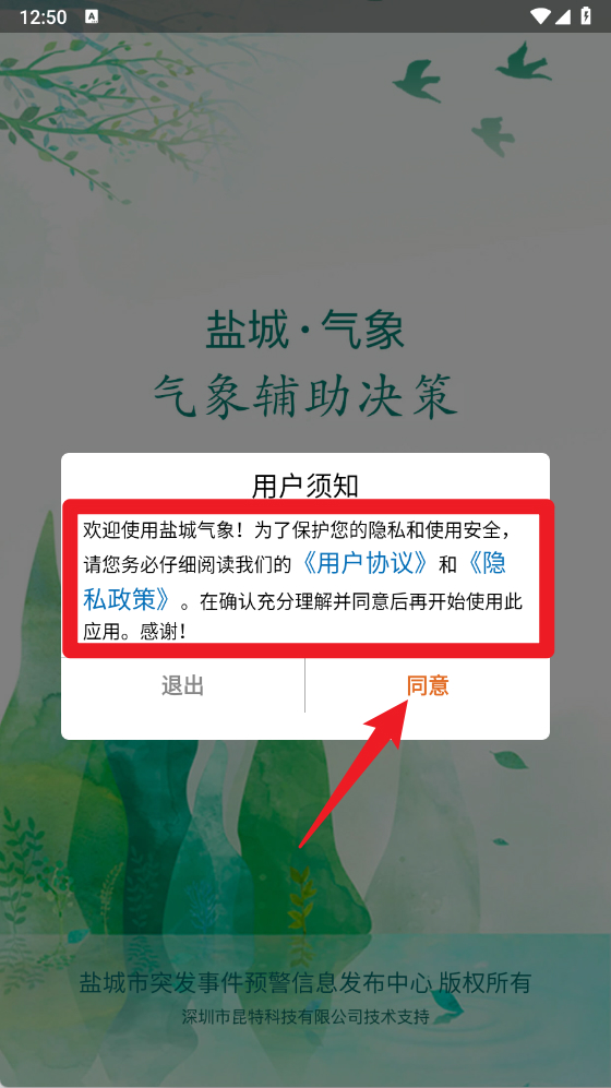1、首次打开盐城气象应用时,会出现用户须知页面,需仔细阅读用户协议,点击同意按钮后方可进入应用。