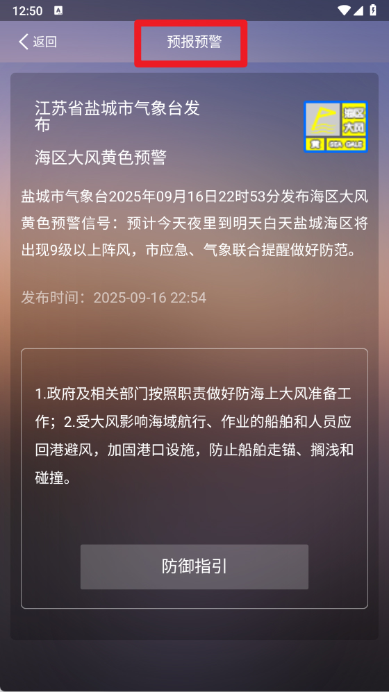 3、点击预报预警栏目,可以查看盐城市气象台发布的最新气象预警信息,帮助用户及时做好防范措施。