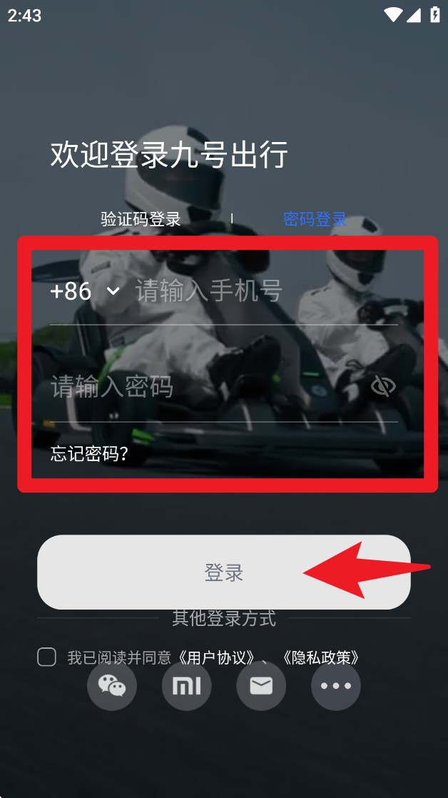 1. 进入App后先进行登录操作,输入手机号及密码,点击下方登录按钮完成身份验证,选择其他方式登录账户。