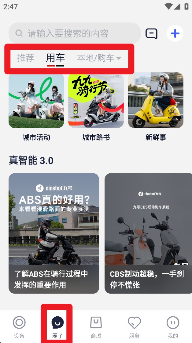 3. 点击底部圈子标签页可浏览骑行资讯与热门活动,切换用车分类可查看骑行测评、官方推荐内容。