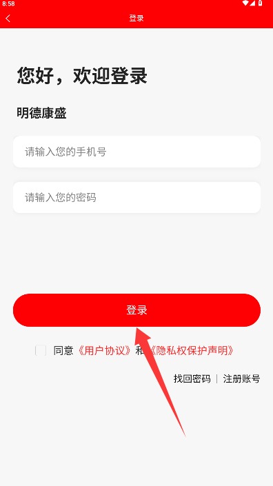 2、在登录页面输入手机号和登录密码,勾选同意相关条款后点击登录进入应用。