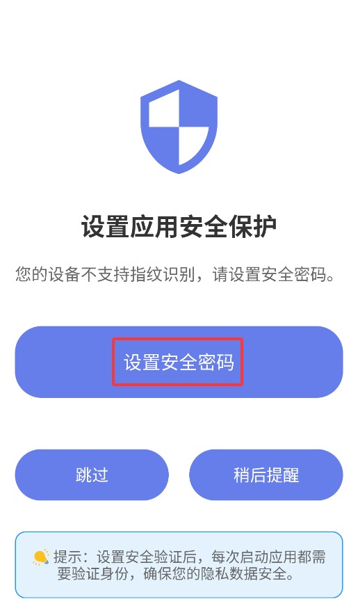 2、可设置应用安全密码,每次启动需通过验证以确保隐私数据保护。