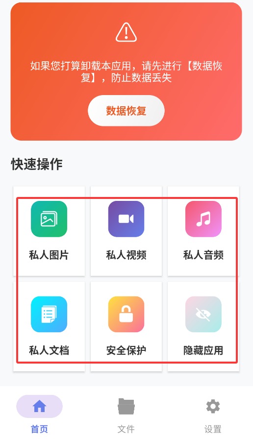 3、在首页快速操作区,可管理私人图片、视频、音频及文档等加密内容。