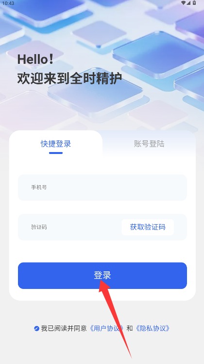 2、在登录界面输入手机号和短信验证码,勾选同意相关协议后点击登录按钮进入。