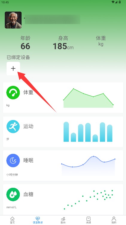3、进入健康管理界面选择添加绑定设备功能,开始进行健康监测设备的绑定操作。