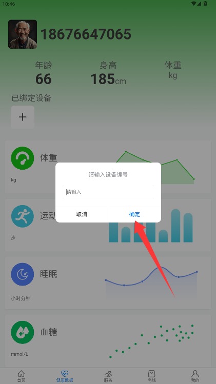 4、输入设备专属编号信息内容,确认后即可完成设备绑定并同步健康数据信息。