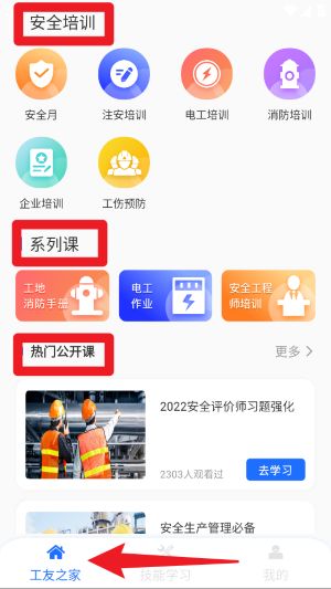 1、在工友之家页面中可进入各类安全培训模块,包括电工培训、消防培训、注安培训等专业课程内容。