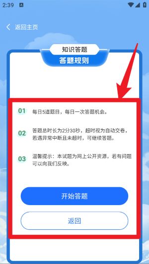 2、进入答题规则页面后,每日可进行一次知识答题,限时2分30秒,答题完成可帮助巩固学习内容。