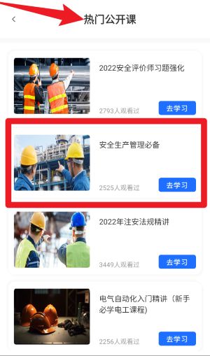 4、在热门公开课页面中可选择如安全生产管理必备等热门课程,点击去学习即可立即开始。