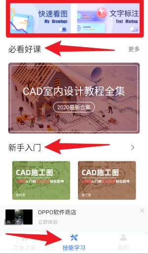 5、切换到底部技能学习栏,可找到必看好课与新手入门专题,适合CAD等技能学习的初学者快速上手。