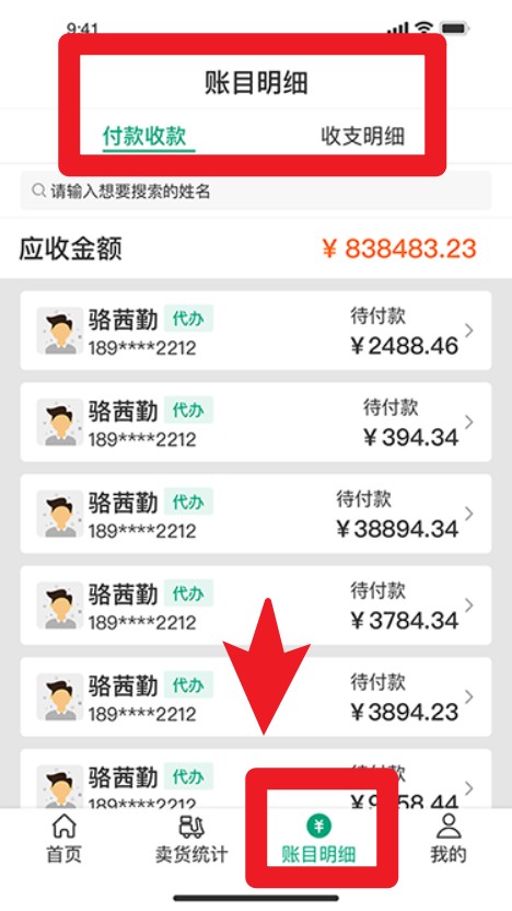 4. 点击底部账目明细可进入付款收款记录页,清楚显示每位收货员的应收金额与状态详情。