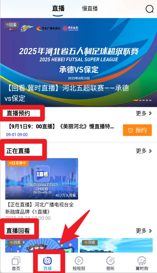 3、在直播页面,分为直播预约、正在直播和直播回看三类,用户可提前订阅节目或随时观看正在进行的内容。