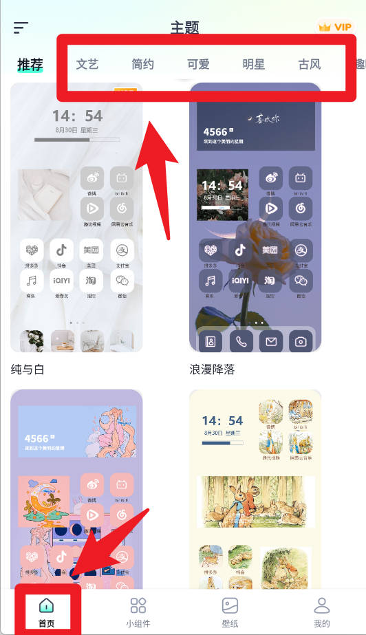 2、在首页界面,可以挑选文艺、简约、可爱、明星、古风等多种主题风格,点击任意主题即可预览并应用到桌面。