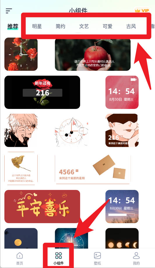 4、在小组件板块,提供明星、简约、文艺、古风等分类,用户可根据需求选择合适的小组件,装点桌面布局。