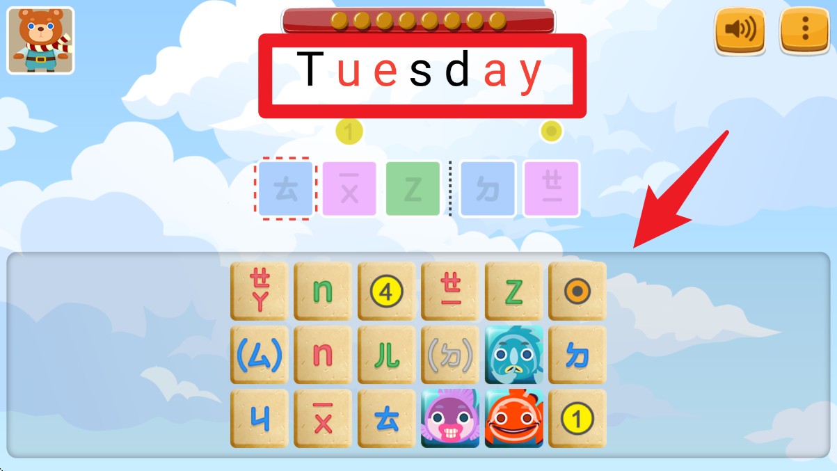 3. 挑战开始后,屏幕会出现目标单词,用户需根据音节与注音提示,从底部区块中拖曳正确拼音组成完整单字。