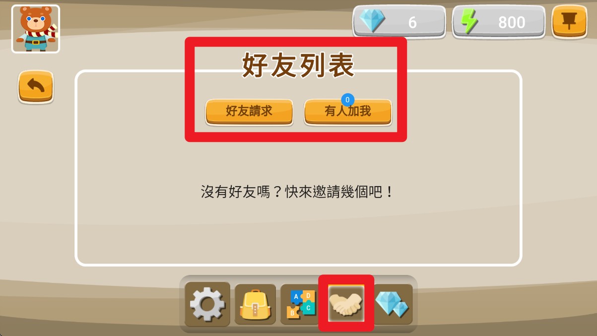 5. 点击底部的握手图标可进入好友系统,在好友列表中查看添加请求或已加好友,进行互动与学习竞赛。