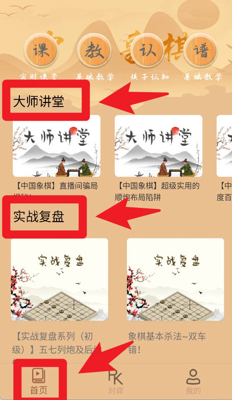 2、在首页中,提供了大师讲堂和实战复盘等功能,用户能够观看讲解视频,还可以复盘经典对局来学习布局与思路。