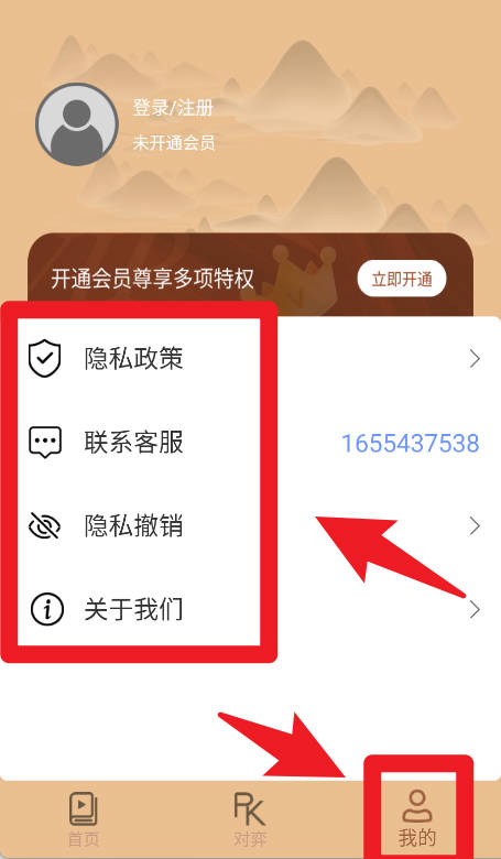 5、在我的页面,用户可查看隐私政策、联系客服和关于我们等相关资讯,亦可使用隐私撤销功能。
