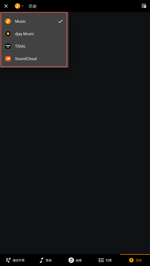 2、提供四种选曲方式,分别是Music、Djay Music、TIDAL、SoundCloud;