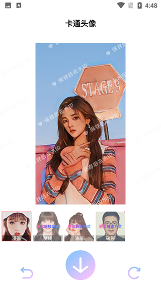 3、图片自动转换为漫画风格,点击屏幕底部保存可去除水印。若提示订购会员,关闭后观看视频即可保存;