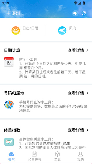1、天气界面提供日出日落、风向等基本信息,还有多种实用工具