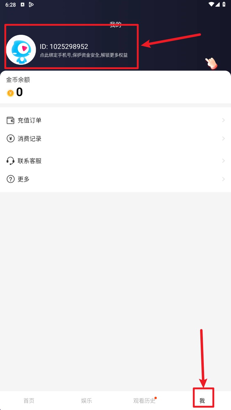 1. 打开App后点击底部导航栏的我,进入个人中心界面并查看用户ID及金币信息。