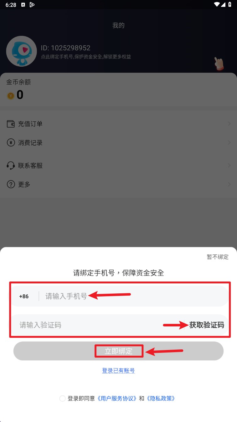 2. 若未绑定手机号,点击头像区域并填写手机与验证码,即可完成账户绑定操作。