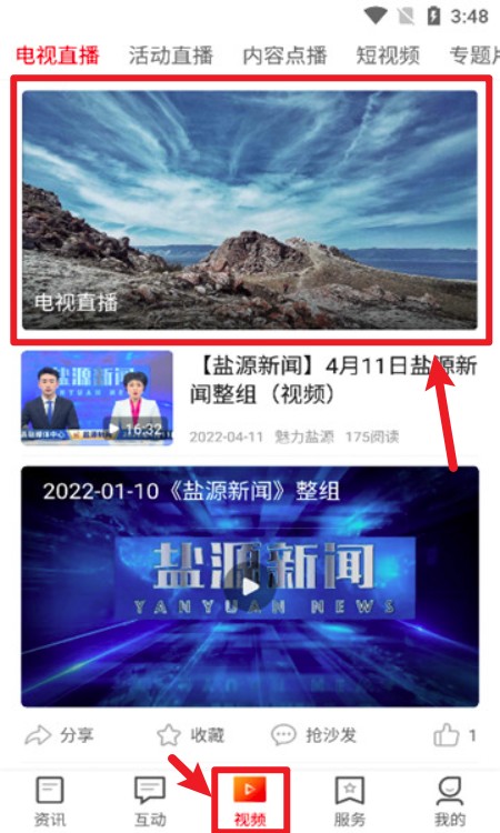 2. 切换至视频栏目,可观看盐源新闻整组、专题视频,点击顶部图像还能进入电视直播专区。