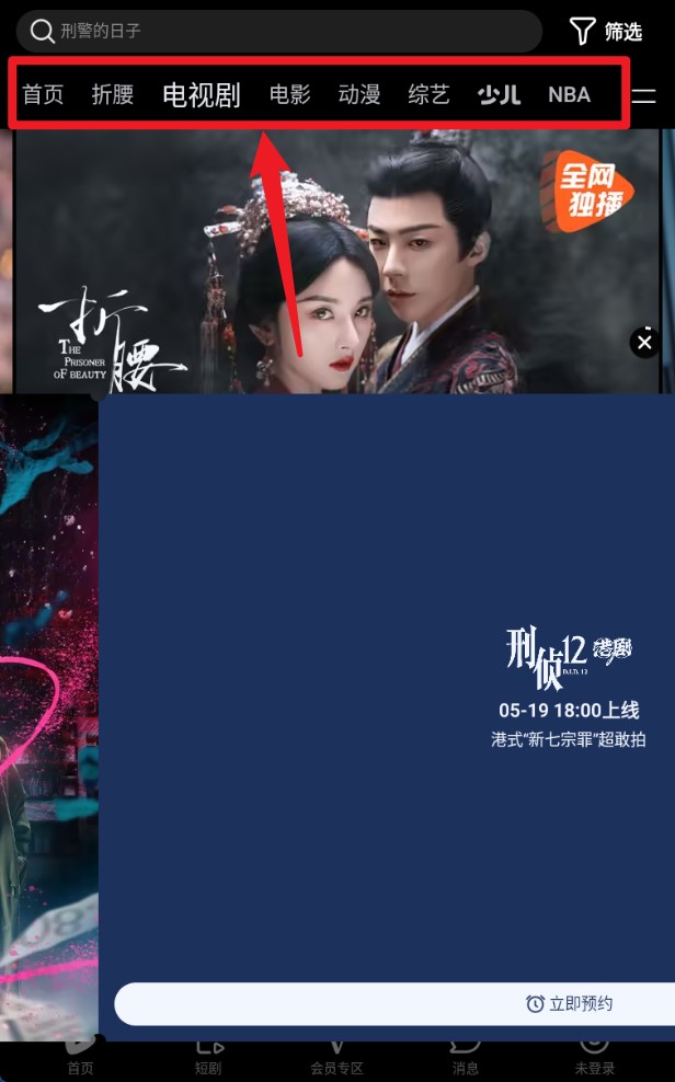 2.切换频道:点击顶部频道导航栏,可切换至电视剧、综艺、动漫等分类内容。