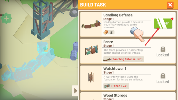 2、点击【Sandbag-Defense】对应的【Gather】,收集材料建造该防御设施。