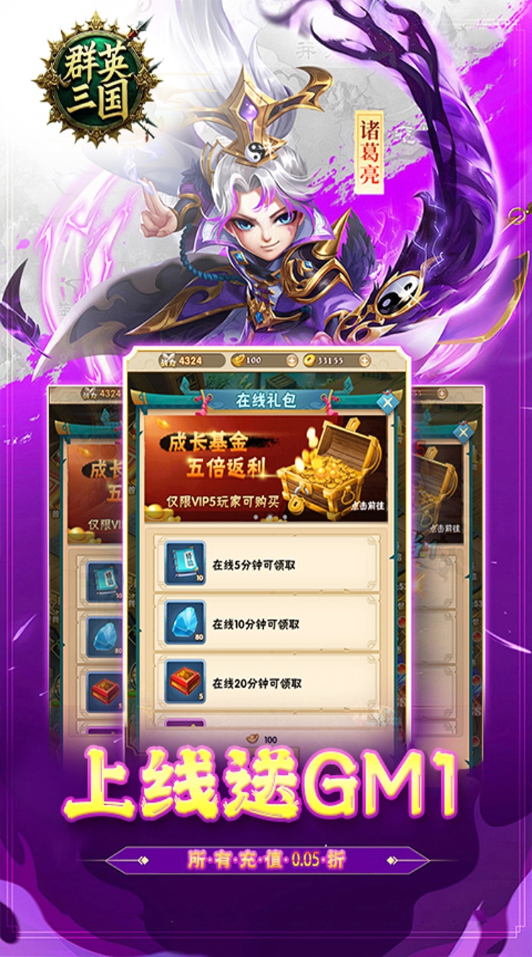 上线即送VIP16,附赠神将赵云与诸葛亮,另可通过邮件领取18888元宝、888888银子等豪华资源,瞬间体验顶级待遇。