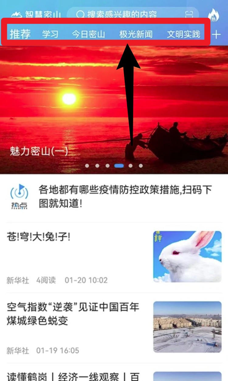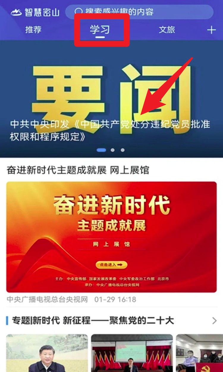 1. 进入App首页后,可在顶部导航栏切换推荐、学习、今日密山等频道,浏览不同资讯内容。