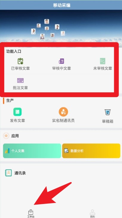 2. 进入工作台后可查看已审核、待审核、批注等文章分类入口。