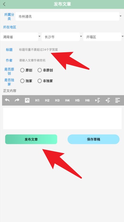 3. 点击发布文章填写标题、作者等信息后,可选择发布或保存为草稿。