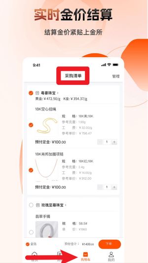 3、在购物车页面可查看采购清单,实时金价结算模式让每笔费用清晰透明,点击下单进行付款操作。