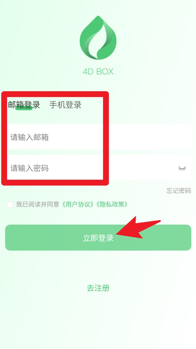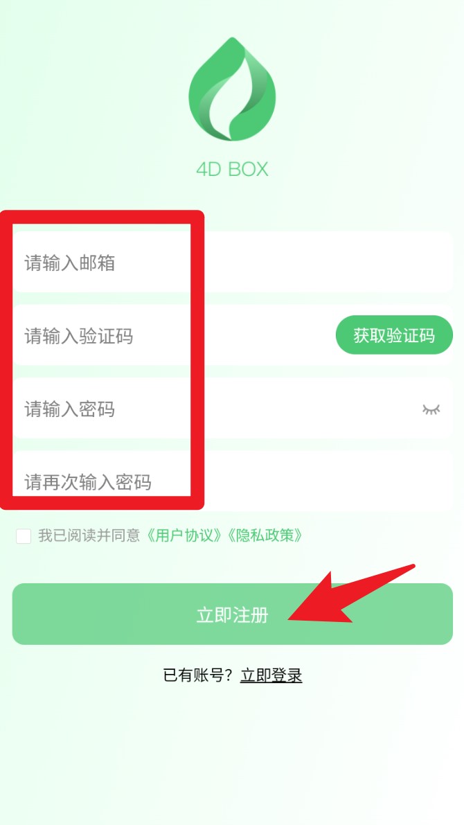 1. 打开App后点击立即注册,填写邮箱、验证码及两次密码后勾选协议,完成注册。