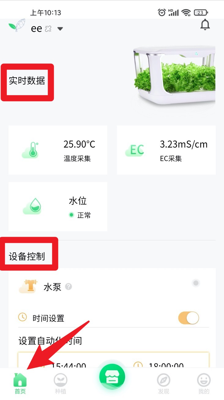 3. 登录成功后进入首页,可查看实时温度、电导率、水位等数值,掌握当前种植状态。