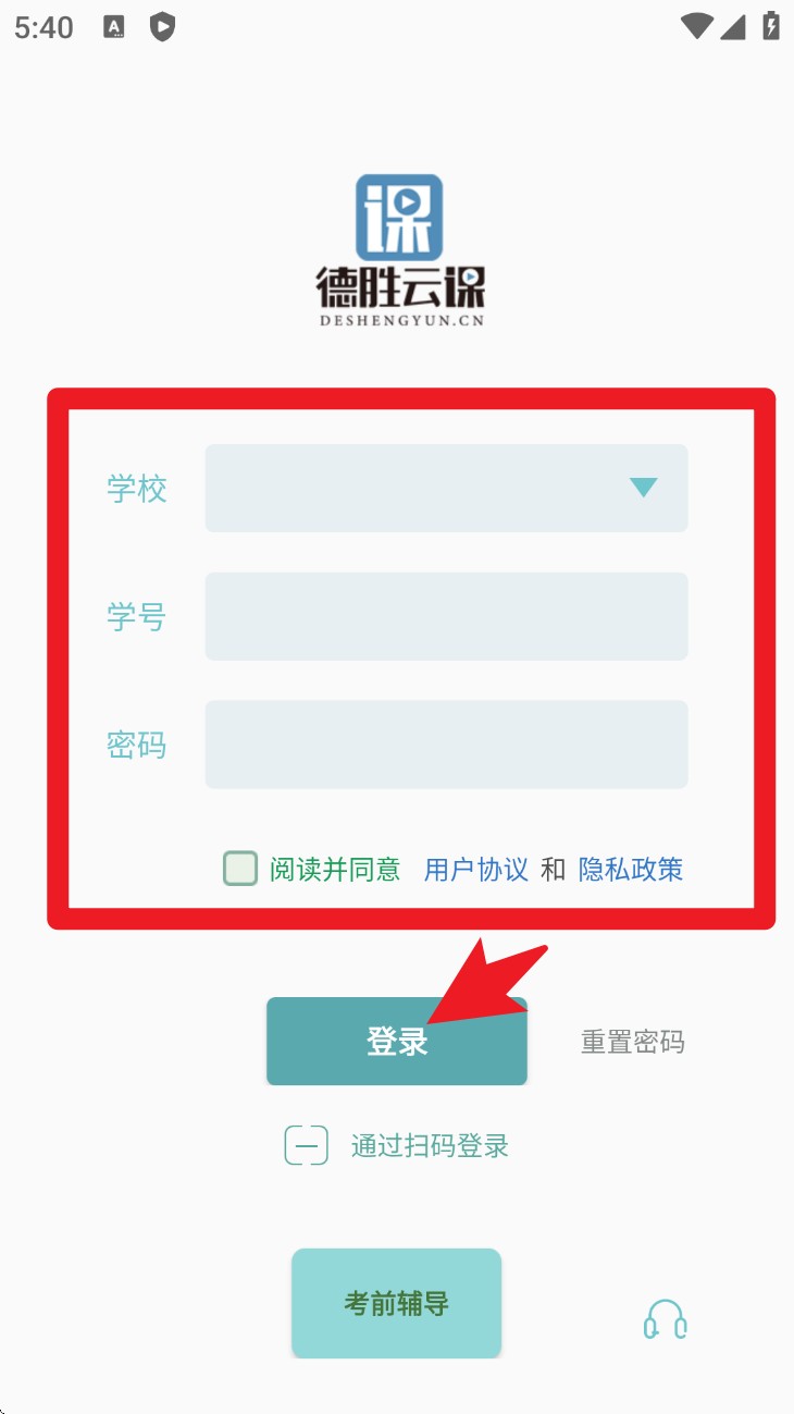 1. 首次登录需选择所属学校并填写学号与密码,勾选同意协议后点击下方登录按钮即可进入系统主页。