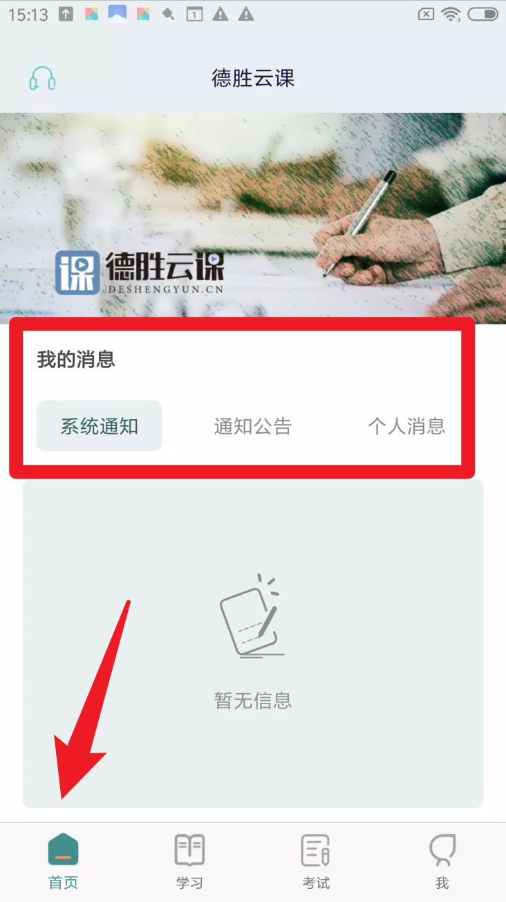 3. 登录后将进入首页模块,点击下方导航栏中的学习按钮即可查看各门课程的学习与考试安排。