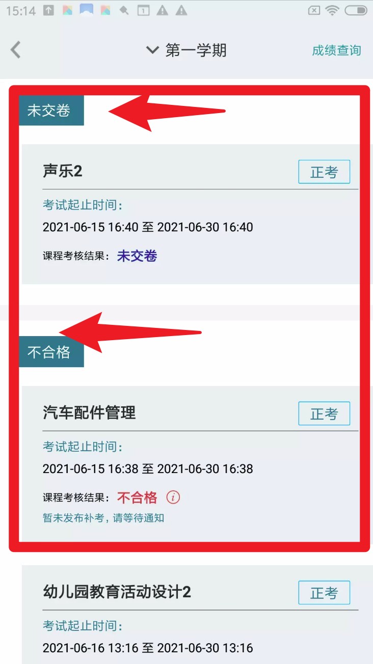 5. 点击考试标签进入成绩查询页面,可查看每门课的考试时间、当前状态及是否合格等详细信息。