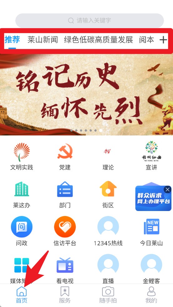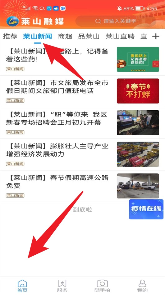 2. 在首页选择新闻分类如莱山新闻,即可查看最新本地资讯推送。