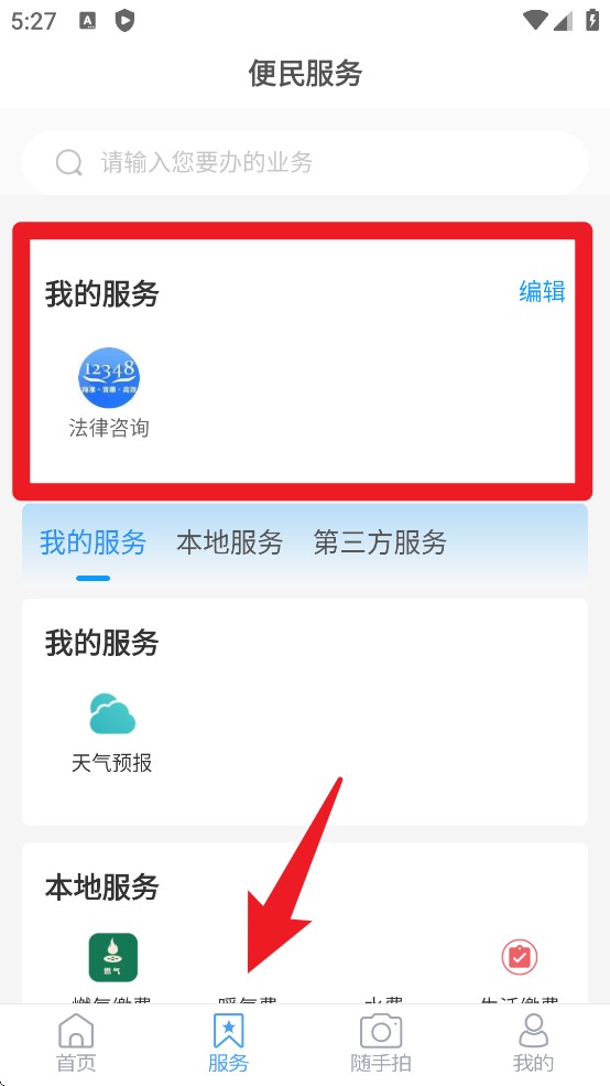 3. 点击底部服务页籤,可查询天气、法律谘询等便民项目,支援自定义收藏。