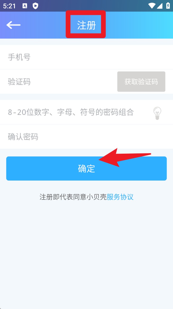 1. 第一次使用需点击注册页面,输入手机号、验证码与密码,阅读协议后点击确定完成账号注册。