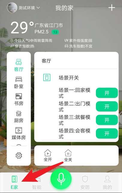 2.登录后进入主界面,点击左下角E家标签,可查看各房间智能控制状态。