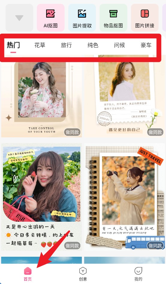 2、热门分类支持主题筛选,用户可根据花草、旅行等标签快速找到想要的图片模板。