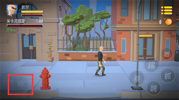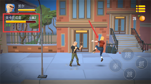 2、用左侧轮盘操控角色移动,右侧【拳-踢】等按钮为攻击技能,先熟悉操作推进【关卡完成度-0.00】。