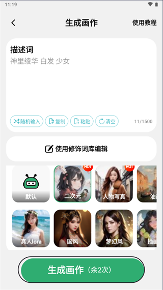 2、进入【生成画作】页面,填写描述词,借助修饰词库编辑,选定画作风格、形状、图片效果;设置完毕后点击【一键生成】;